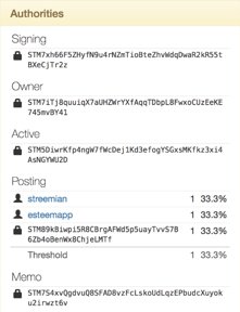 또 다른 예는 Steem 블록체인인데, 이것은 세 가지의 하드 코딩된 지정 승인 수준 – 소유자, 활성 및 포스팅 - 을 가지고 있다. 포스팅 승인은 투표와 포스팅과 같은 사회적 기능만 수행할 수 있는 반면, 활성 승인은 소유자 변경을 제외한 모든 것을 할 수 있다. 소유자 승인은 저온 저장(cold storage)을 의미하고, 모든 것을 할 수 있다. EOS.IO는 각각의 계정 소유자가 자기 자신의 계층을 규정할 수 있도록 해줄 뿐만 아니라 활동을 그룹으로 묶을 수 있도록 함으로써 이 개념을 일반화 해준다.